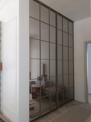 Розсувна перегородка з нижньою напрямною, з тонованим напівпрозорим склом. В якості декору використані накладні шпроси. Перегородка виконана з профілю бренду Raumplus системи S1200 виробництва Німеччини.
