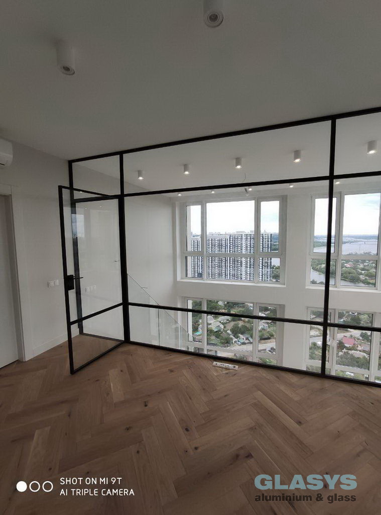 В дворівневій квартирі кімната верхнього поверху відокремлюється від зони нижнього рівня за допомогою інтер’єрної перегородки зі скла та алюмінію.