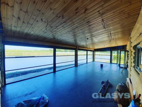 Оскільки навколо будівлі гарний пейзаж, ми запропонували гільотинну систему, ща дала можливість використовувати приміщення взимку як закритий майданчик, а влітку як відкриту терасу.
