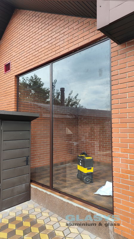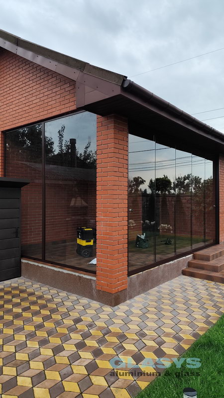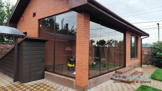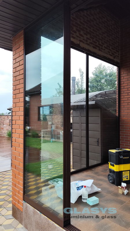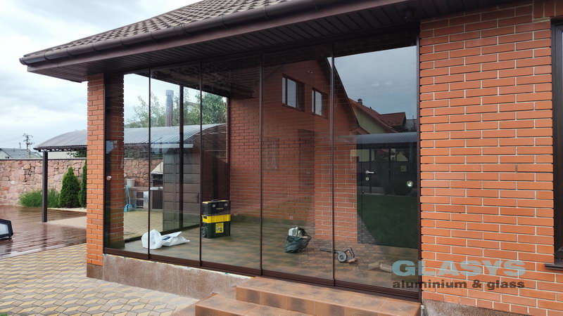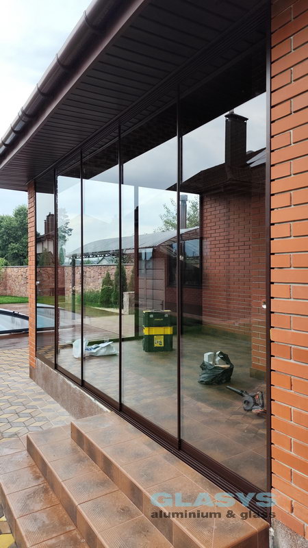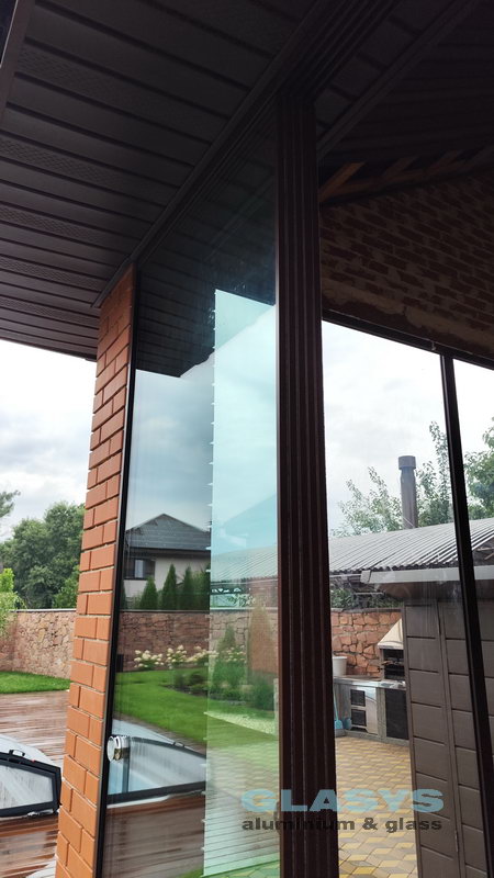 Для засклення терраси використані розсувна система з нижньою направляючою Asistal AB160 і глуха холодна віконно-дверна система Altest Universal-450 . Для зручності у розсувної ситеми нижня рельса затоплена в підлогу, що дуже зручно для пересування.