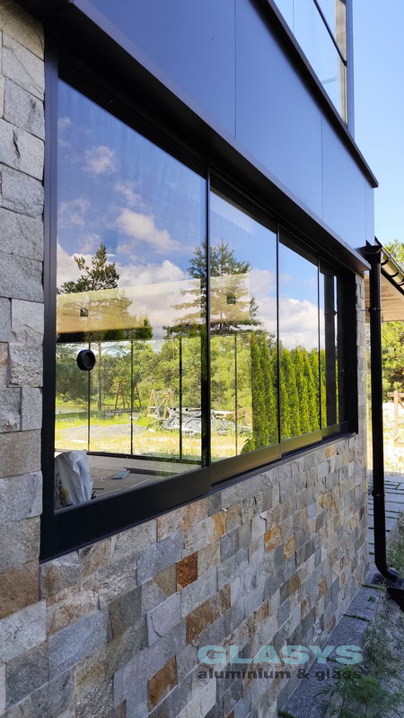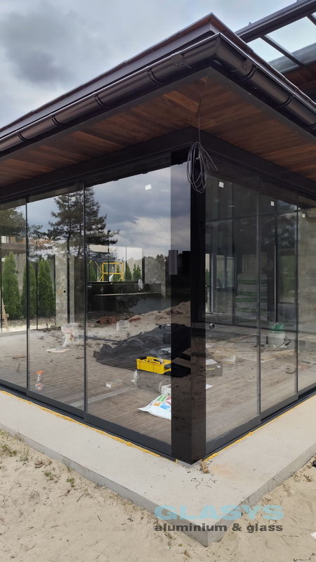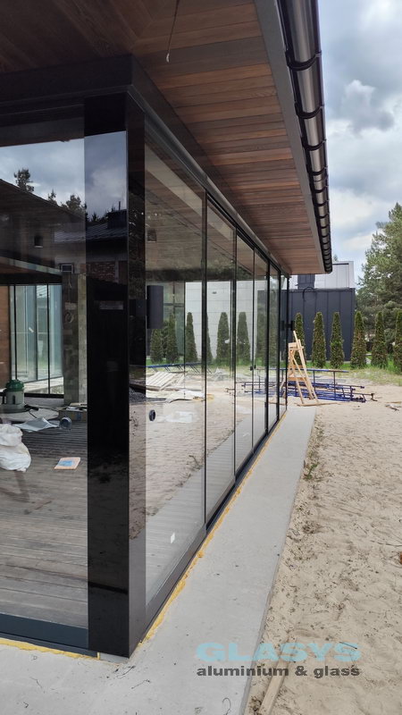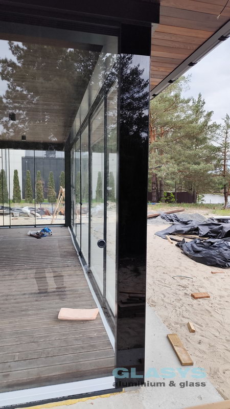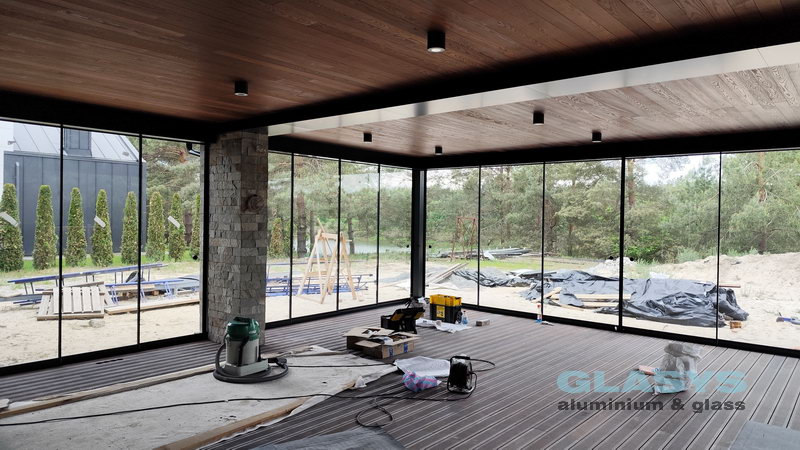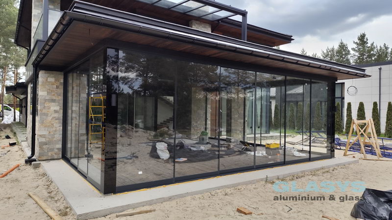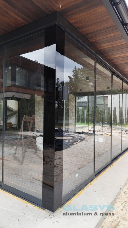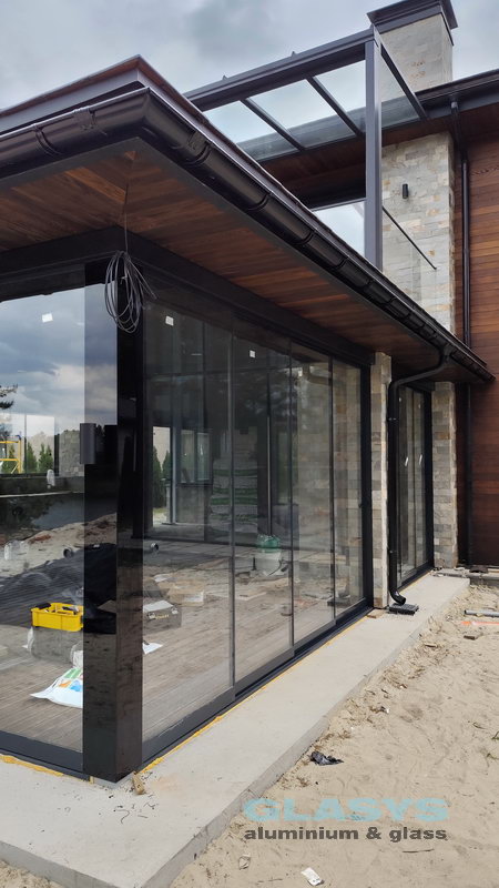 Замовник вирішив розширити корисну площу будівлі за рахунок заскленої терраси. Ідея полягала в тому, щоб мати можливість в холодний період року захиститись від опадів і вітру, а влітку мати можливість відкрити всі стулки і почувати себе на відкритому просторі.