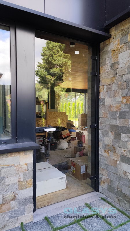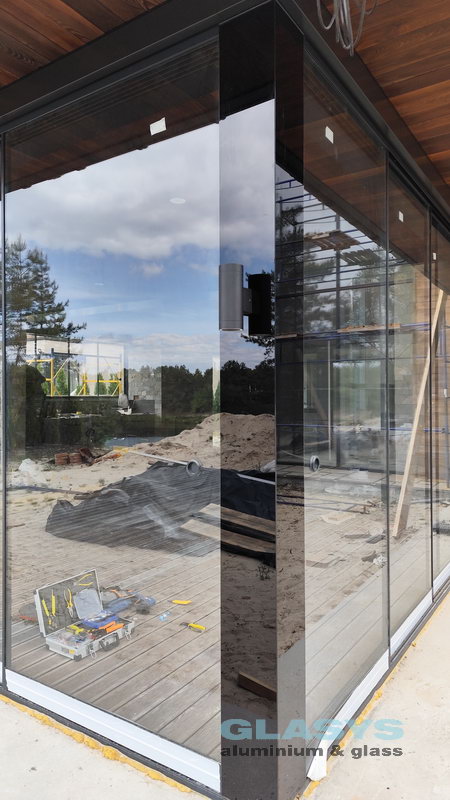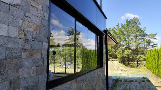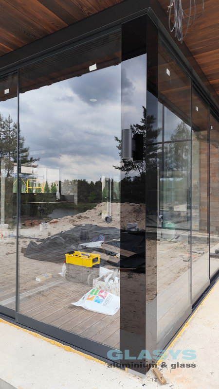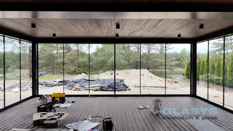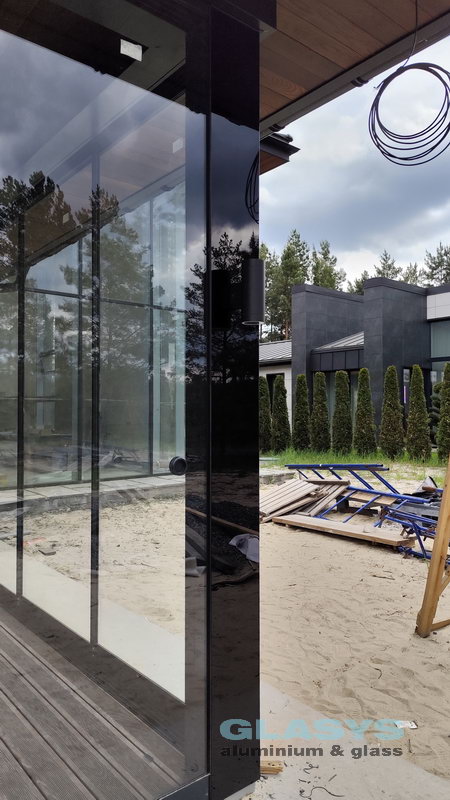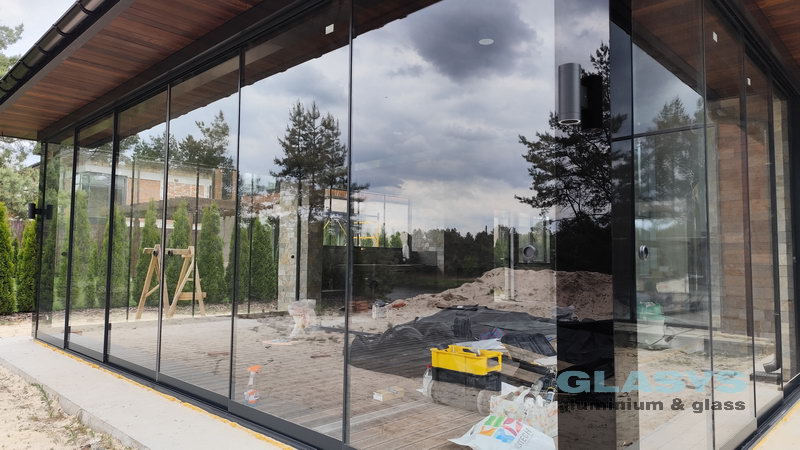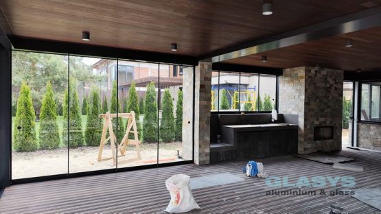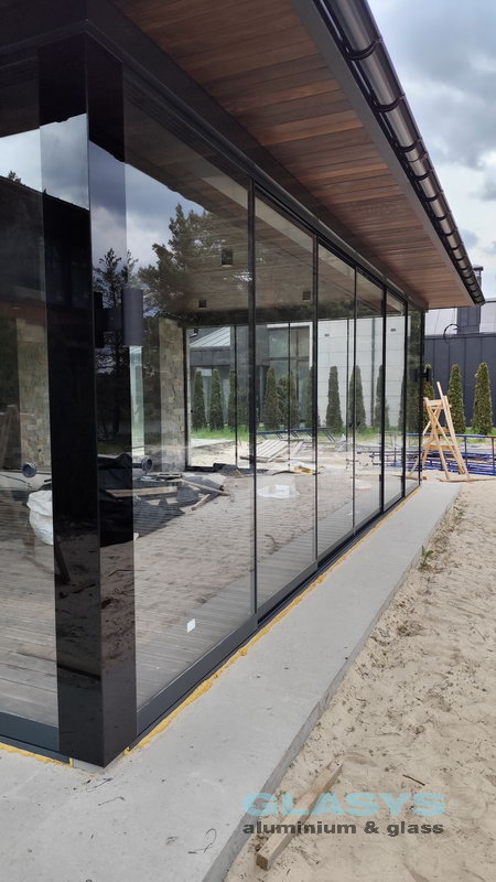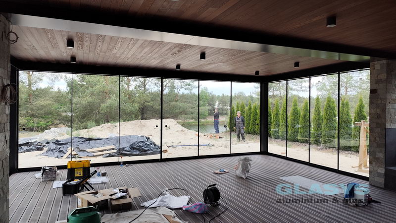 Замовник вирішив розширити корисну площу будівлі за рахунок заскленої терраси. Ідея полягала в тому, щоб мати можливість в холодний період року захиститись від опадів і вітру, а влітку мати можливість відкрити всі стулки і почувати себе на відкритому просторі.